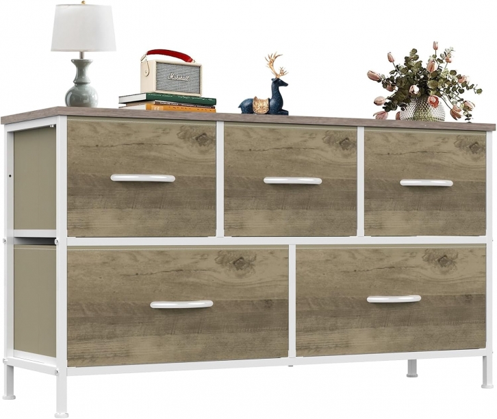 Amazon offers OLIXIS Dresser for Bedroom with 5 Drawers, Wide Chest of Drawers, Fabric Bedroom Dresser with Drawer Organizer, Storage Organizer Unit with Fabric Bins for Closet, Living Room, Hallway, Greige Oak for + free shipping with Prime. Product Description:- 【Multifunction Cabinet】Just place this space-saver drawer in the closet as bedroom furniture to offer a home for workout gear, blankets, and lingerie; place it in the nursery as a chest of drawers to store clothes and stuff; place storage drawer in the entryway for storage saving unit for frequently used items.