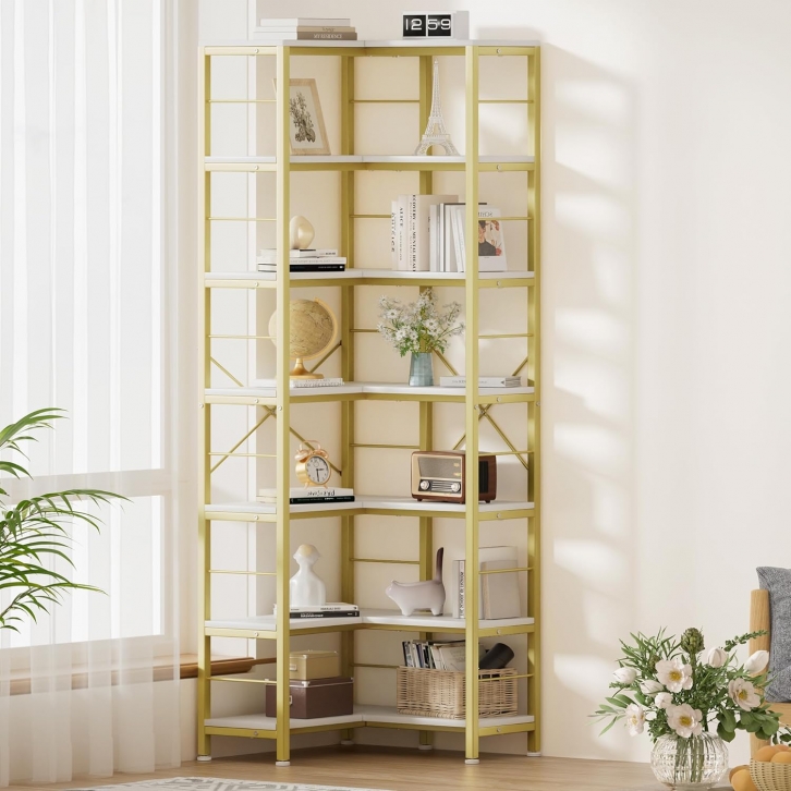 Amazon offers 7-Tier Corner Bookshelf, 80" Tall Corner Bookcase,7-Shelf Industrial L-Shaped Coner Shelf with Metal Frame for Home Office,Living Room,Bed Room(Gold) for + free shipping with Prime. Product Description:- 【Space-Saving Design】This corner shelf stand is cleverly designed to maximize corner space, keeping your area clutter-free and organized for the long haul. It's perfect for those who desire a tidy environment or are looking to upgrade their shelving solutions.