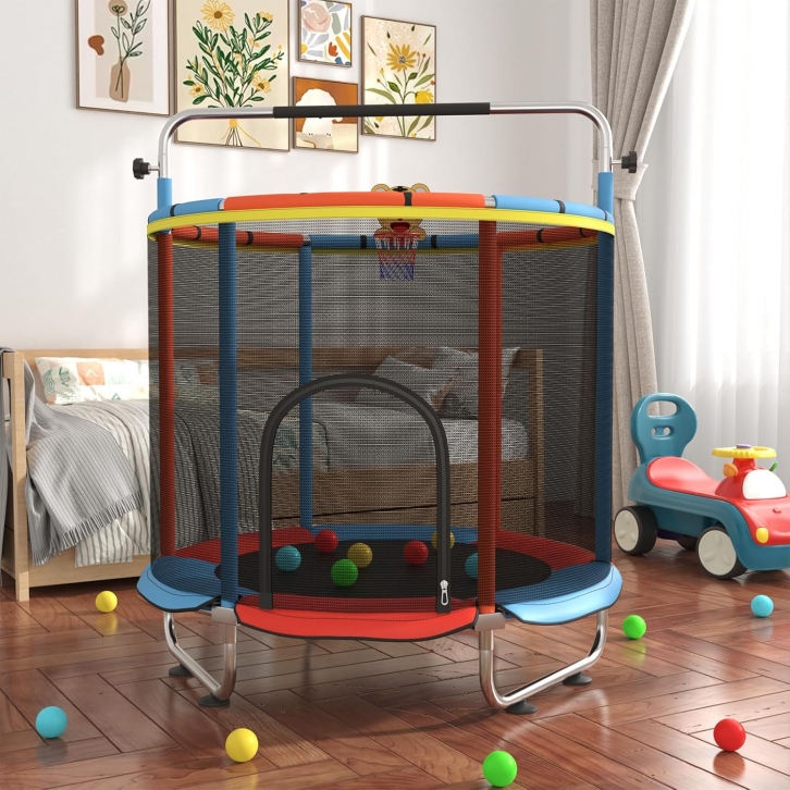Amazon offers 60" Toddler Trampoline for Age 2-4, 5ft Mini Kids Trampoline Indoor with Basketball Ball Adjustable Gymnastics Bar & Toys Swing Enclosure Net for Backyard ASTM Approved for + free shipping with Prime. Product Description:- Multi-Functional Design for Fun and Exercise: Equipped with an adjustable gymnastics bar, basketball hoop, punching bag, and gym rings, Maemttes trampoline combines entertainment with physical activity. The included toy swing provides endless fun for toddlers aged 2-4, creating an engaging and active play area.