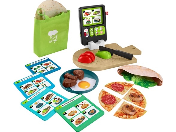 Product Description: Preschool kids can prep, serve, and discover fresh learning fun with the Laugh & Learn 1-2-3 Follow the Recipe Meal Kit from Fisher-Price. Inspired by grownup meal kit services, this 30-piece pretend cooking set features food pieces to “chop” and an interactive tablet toy that reads each recipe card to help guide mini chefs with step-by-step instructions to prepare each dish. Three Smart Stages learning levels grow along with your child and introduce fractions, size & sequencing and more with 125+ songs, sounds and phrases!