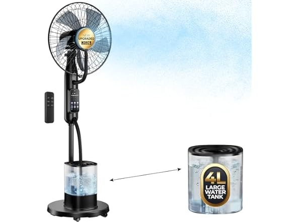 Woot offers Misting Fan, 2026 Upgraded 4L Large Water Tank Mister Cooling Fan, 5 Speeds 3 Modes Misting Standing Fan, Floor Fan with Remote for Home, Bedroom, Patio, Outdoor Pcs for $89.99 (orig. $149.99) + free shipping with Prime. Product Description:- Stay Cool Anywhere with Wide-Angle Airflow: Tired of hot spots in your room? Our misting fan swings 70° side-to-side and tilts over 15° vertically to deliver smooth, even airflow and fine mist wherever you need it. From the living room to the bedroom, or even a small balcony, it keeps every corner refreshingly cool—no more uneven, stuffy heat