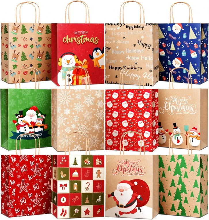 DeckTheHalls 24 Pack Christmas Gift Bags with 12 Stylish Prints, Christmas Tote Bags with Sturdy Handle, Reusable Xmas Kraft Gift Bags for Holiday Gifts, Party Favors, Ideal for Wrapping Gifts