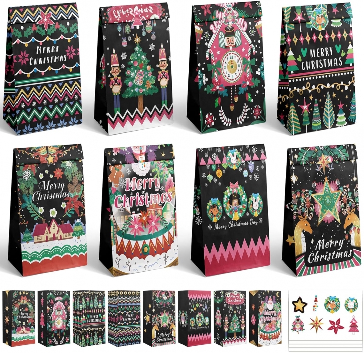 qiqee Christmas Treat Paper Bags Black Mini Xmas Party Candy Goodie Snack Bags (32Pcs Stickers 5"x3"x9.5")