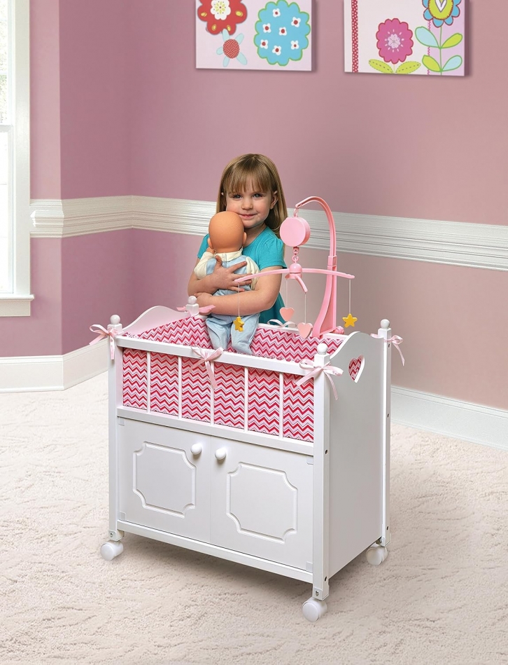 Badger Basket Wooden Toy Doll Bed with Storage, Mobile, and Bedding - Includes Wheels and Free Personalization Kit to Pretend and Play - White with Pink Chevron Fabric +
