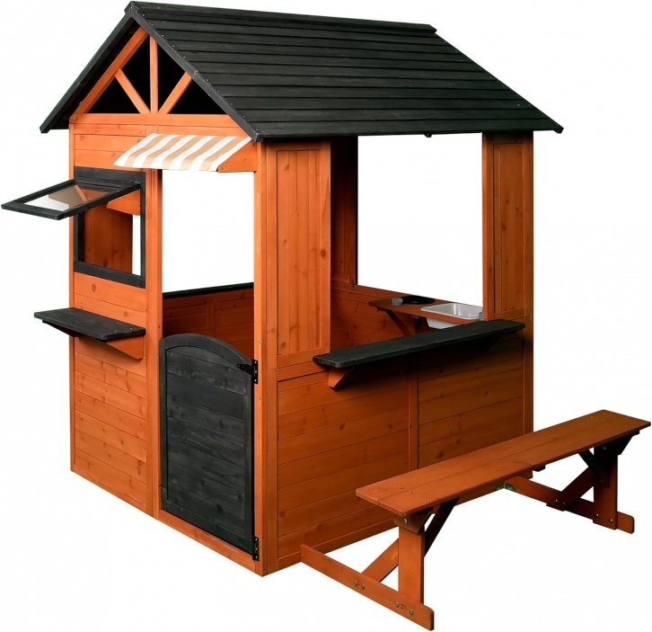 Easy Playhouse: Big Outdoor Wooden Playhouse - Working Door & Windows, Side Serving Station & Bench, Sink & Stove, Backyard Creative Toy Home +
