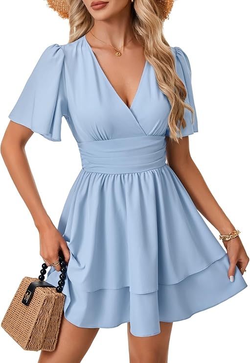 Rooscier Women's Deep V Wrap Neck Layered Ruffle Hem A Line Short Sleeve High Waist Mini Dress