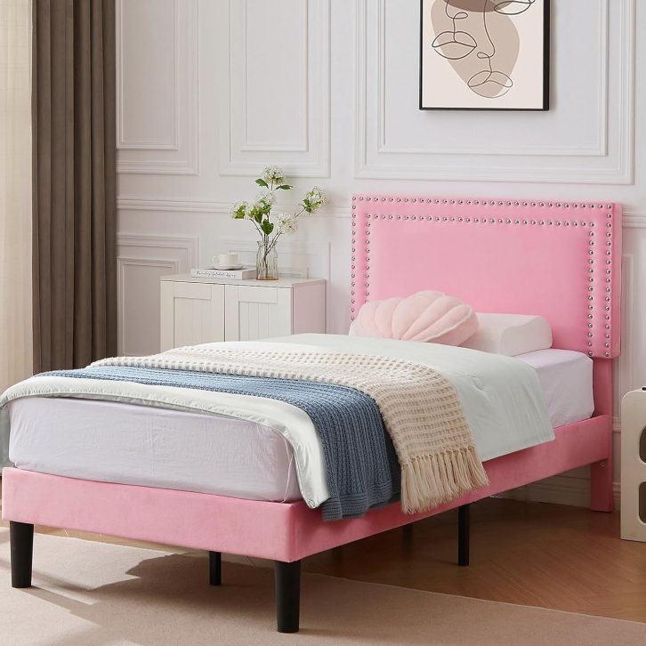 VECELO Twin Size Platform Bed Frame with Height Adjustable Upholstered Headboard, Modern Mattress Foundation,Strong Wood Slat Support, No Box Spring Needed, Easy Assembly +