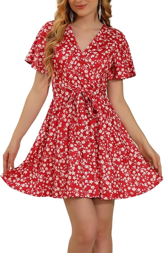 Aphratti Women's Fit and Flare Summer Dresses V Neck Short Sleeve High Waist Casual Floral Faux Wrap Dress, AC