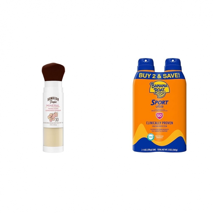 Hawaiian Tropic Mineral Powder Sunscreen Brush SPF 30 & Banana Boat Sport Ultra Water Resistant Sunscreen Spray SPF 50 Twin Pack +FSSS